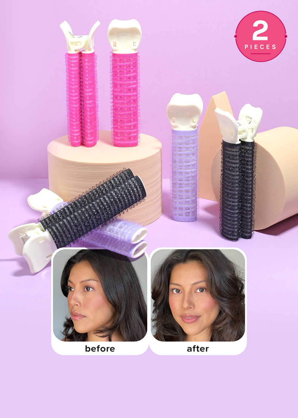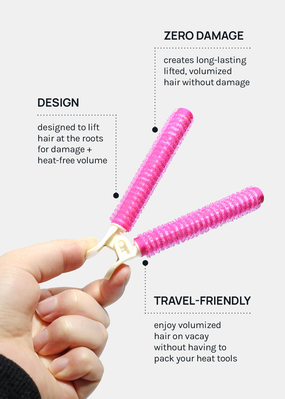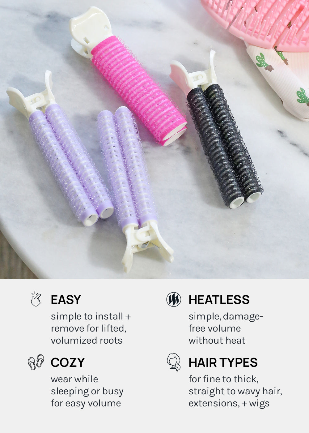 2-in-1 design features a gripping roller + styling clip that adds instant volume by lifting hair at the roots for damage + heat-free, easy, + long-lasting fullness.