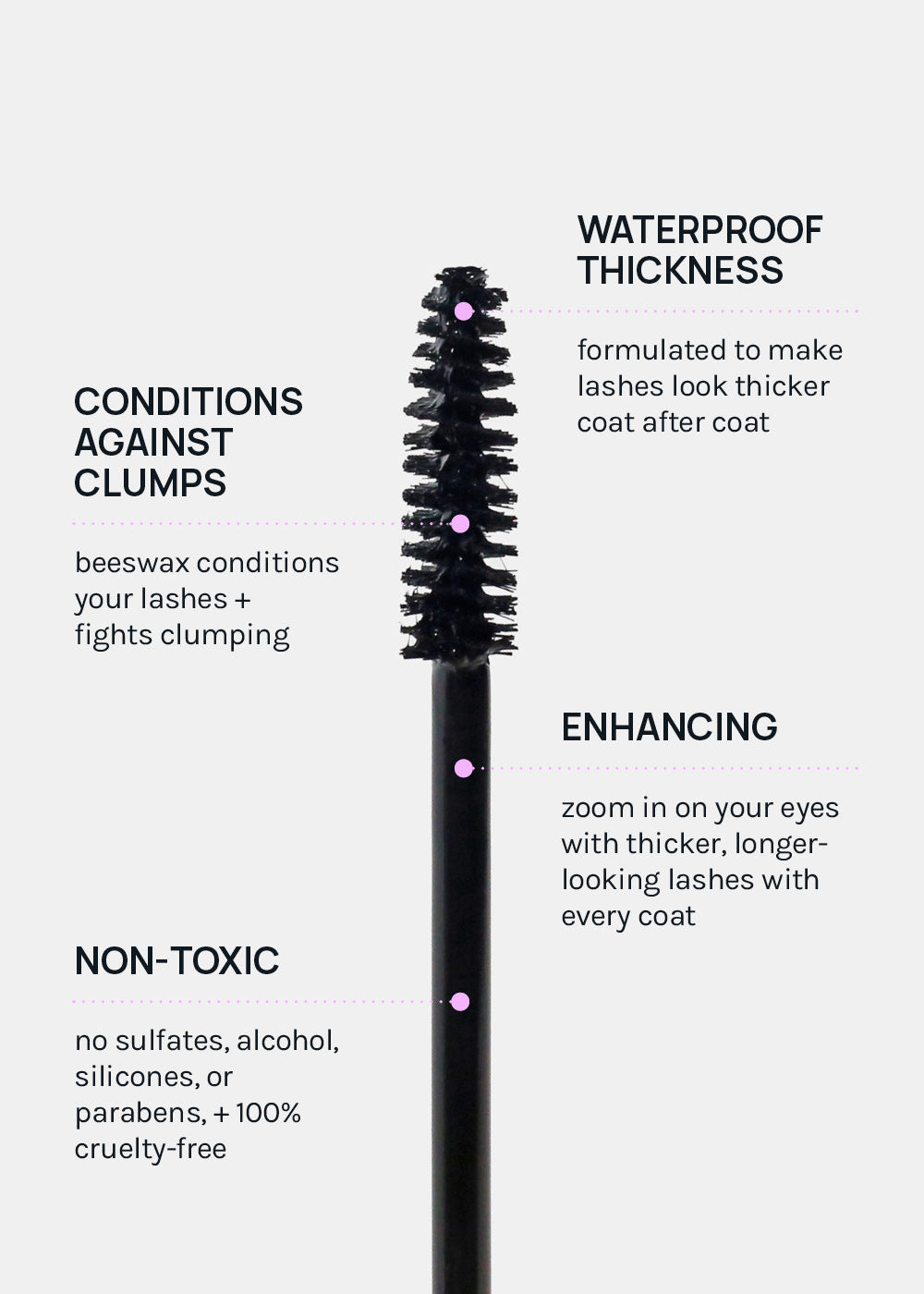 Unlock the full potential of your natural lashes with AOA Studio's Lux Lash Waterproof Mascara. This rich black mascara is designed to lengthen, volumize, + define every lash, with zero clumps, zero flakes, + zero smudges. Whether you're braving a rainy day, hitting the gym, or dancing the night away, this mascara is 100% anything-proof.