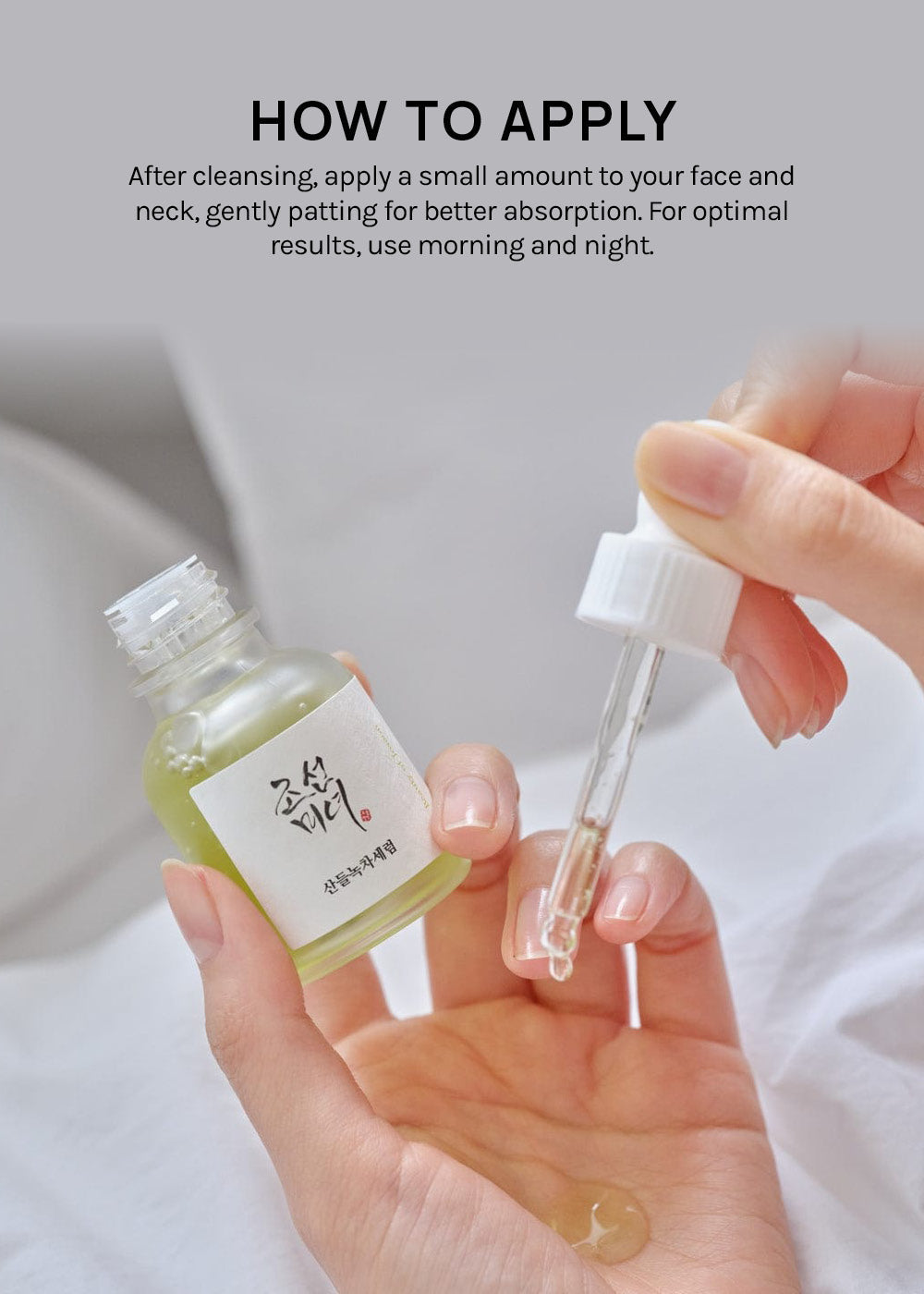 Apply 2-3 drops of serum onto the skin and pat gently to help absorption.