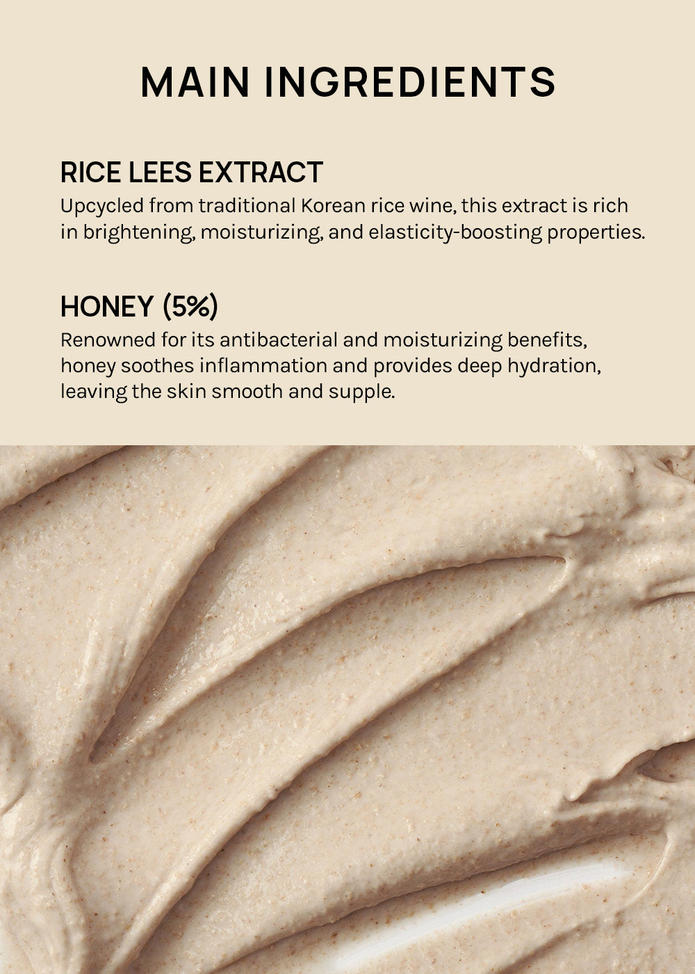 This all-in-one mask combines the benefits of brightening, antioxidant, moisturizing, improving skin elasticity, scrubbing, and soothing (cooling) effects. The synergy of upcycled makgeolli lees, honey, clay powder, and rice hull powder ensures thorough skin care in one step.
