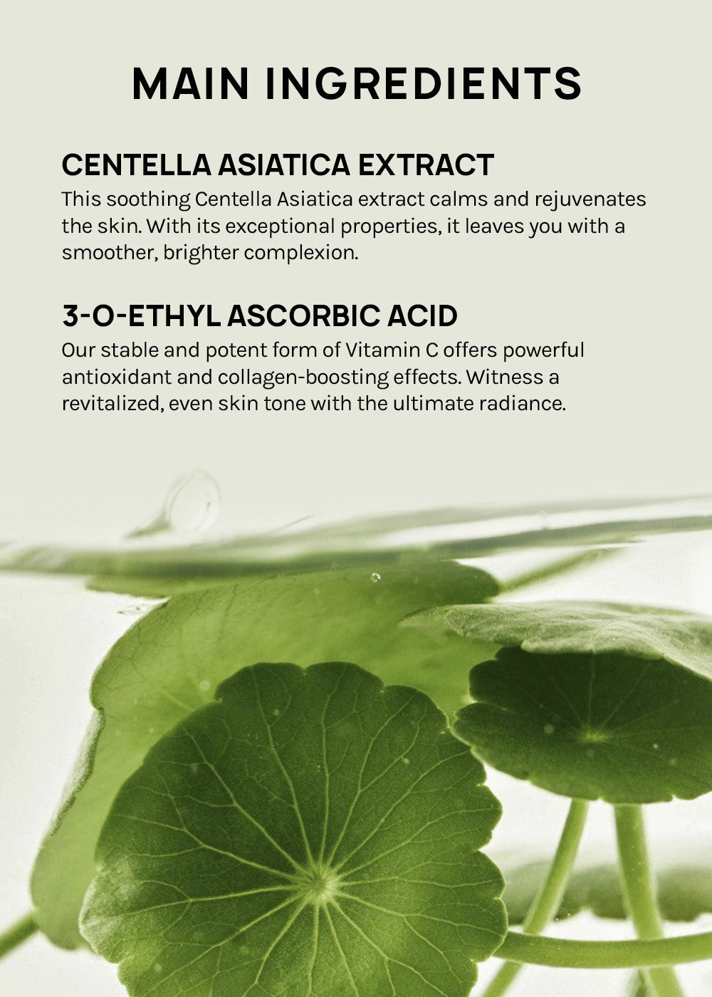 Centella asiatica, which has long been used for medicinal purposes in Asia, is also called tiger grass because wounded tigers actually used to heal their injuries by rolling around in Centella asiatica. Madecassoside, Asiaticoside, Madecassic acid, and Asiatic acid from centella asiatica are effective in soothing and regenerating the skin and also help manage moisture and improve skin tone.