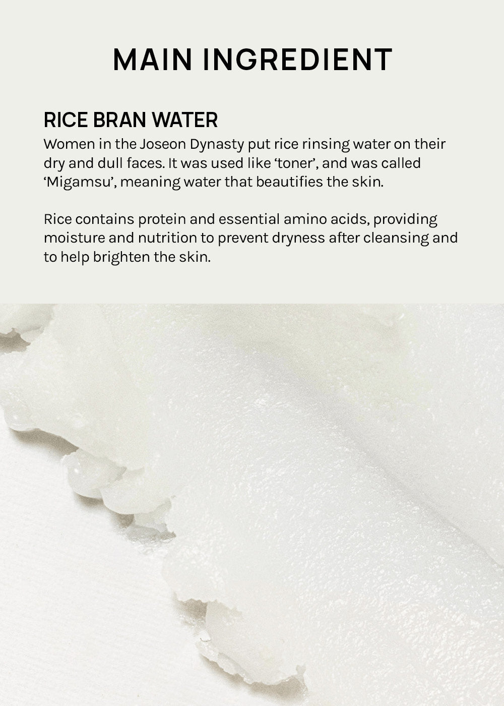 Rice has played a very important role as a staple food and skin care ingredient in Korean history. In the Joseon Dynasty, rice bran water was used like the toner of today, and was called Beauty Water, used for beautiful skin. Rice bran is rich in amino acids and minerals, helping to moisturize dry skin.