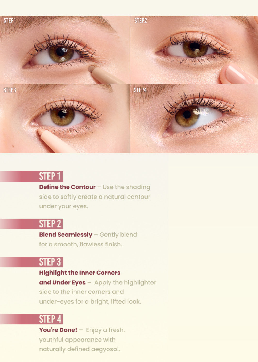Achieving a flawless aegyo-sal look is simple with our step-by-step application guide. First, draw a shadow with the shade liner to create depth. Next, add volume with the shadow/concealer for a more pronounced effect. Finally, blend lightly with your fingertip for a seamless finish. This easy process ensures that you achieve the perfect aegyo-sal look every time.