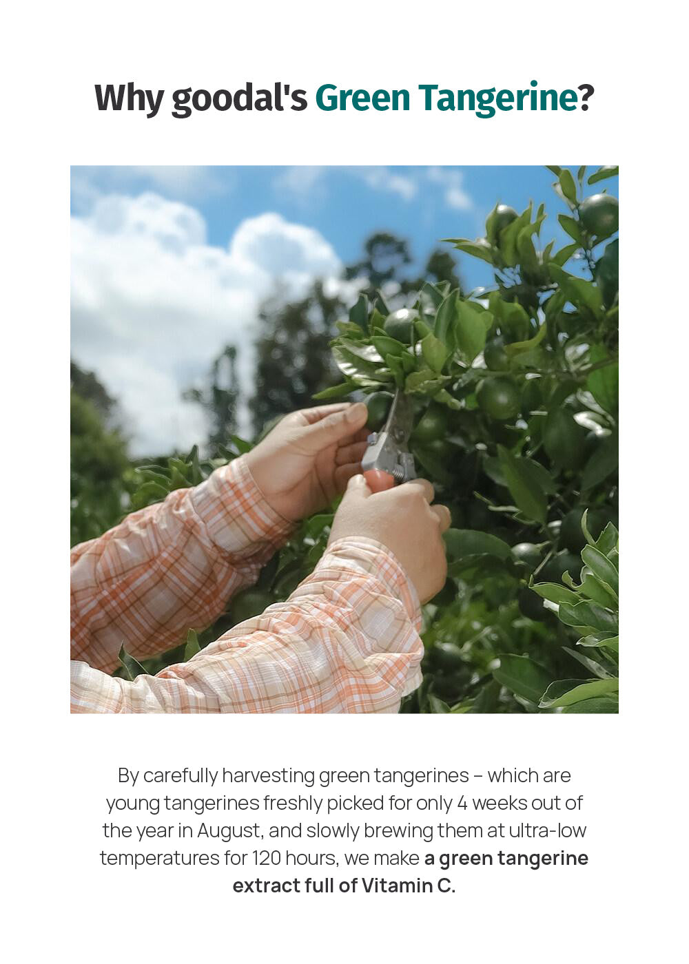 Our organic green tangerines are nourished with fermented soybeans (natural fertilizer) to produce the healthiest ingredients for your skin. They are hand-picked during a small window in July (4 weeks out of the entire year) when levels of vitamin C are the highest. Only the freshest tangerines are infused into our formula to create the perfect skin-boosting fruit water toner pads!