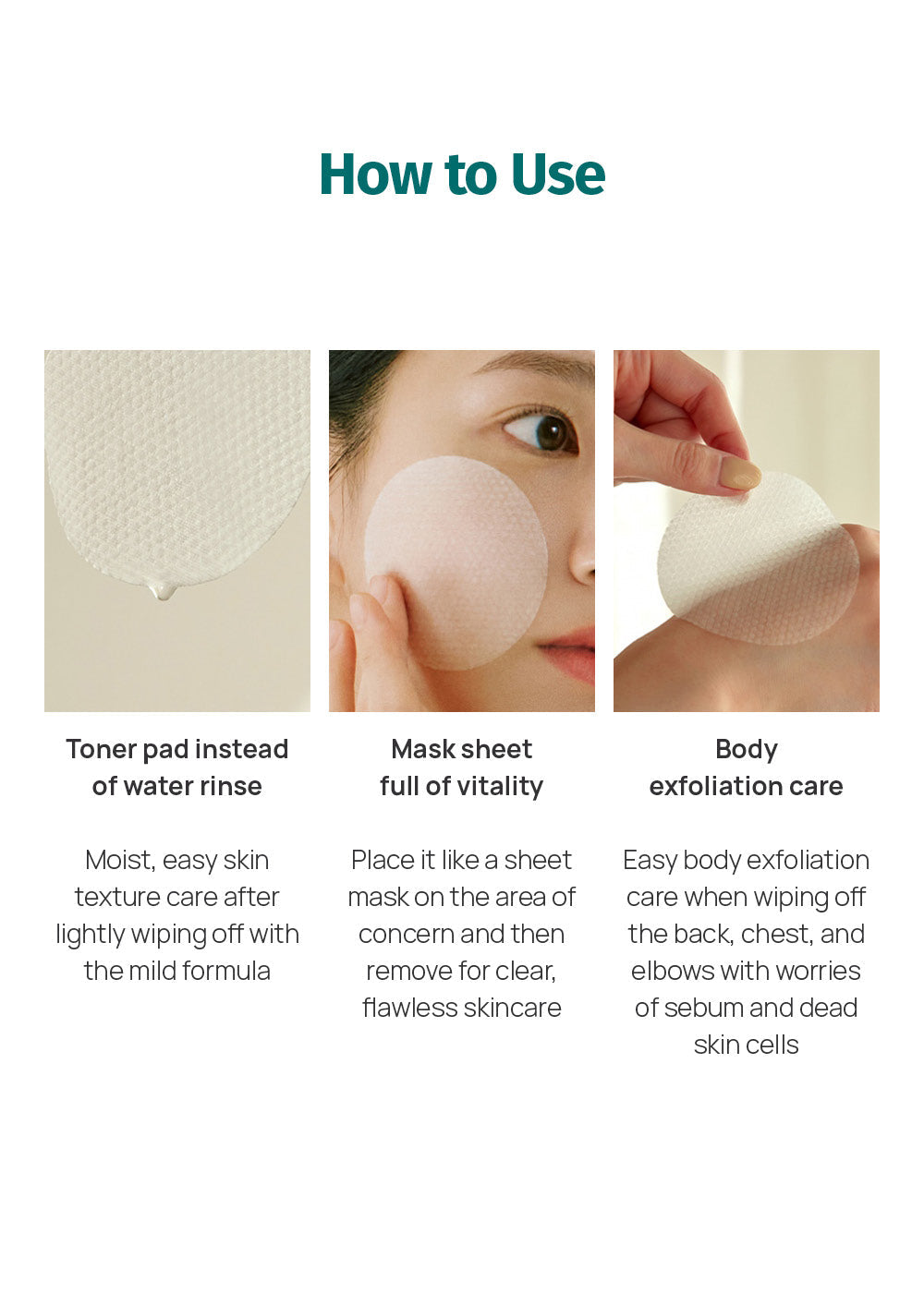 Gently wipe the face with the soft side of the pad. Use the embossed side of the pad to remove residual impurities on areas such as the bridge of the nose, the forehead, and the chin.