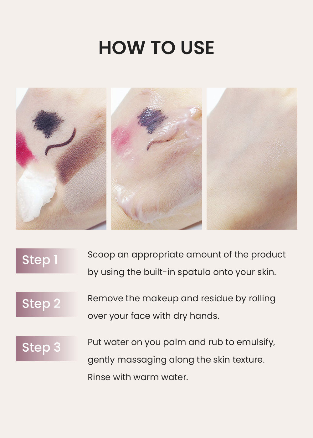 Use the spatula to scoop a moderate amount of balm on to your dried face. The balm will start to melt at this point. Gently massage the product, spreading it to areas you want to cleanse and wash off with warm water.