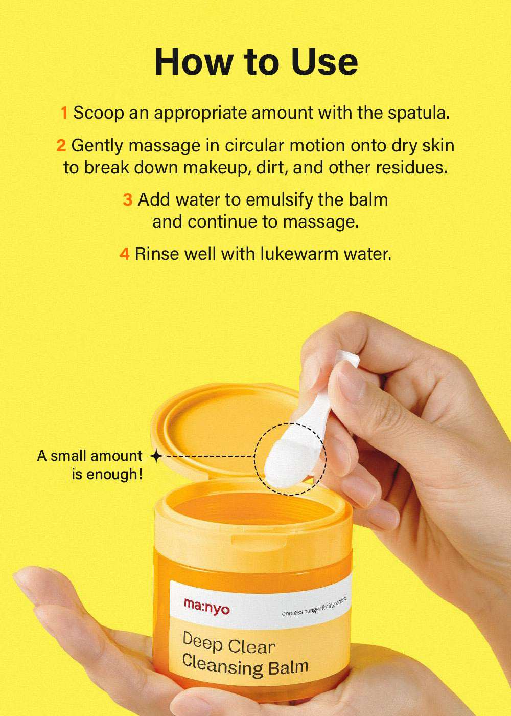 Scoop appropriate amount by using built-in spatula. Gently massage in circular motions onto dry skin to break down makeup, dirt, and other residues. Add water to emulsify the balm and continue to massage. Rinse well with lukewarm water.