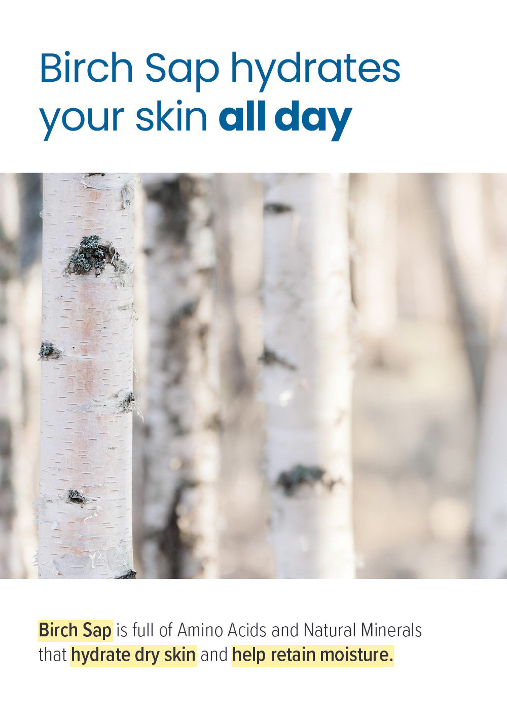 Amino acids, minerals and Birch Sap vitamins form a moisture-packed barrier to protect skin from drying and prevent loss of hydration.