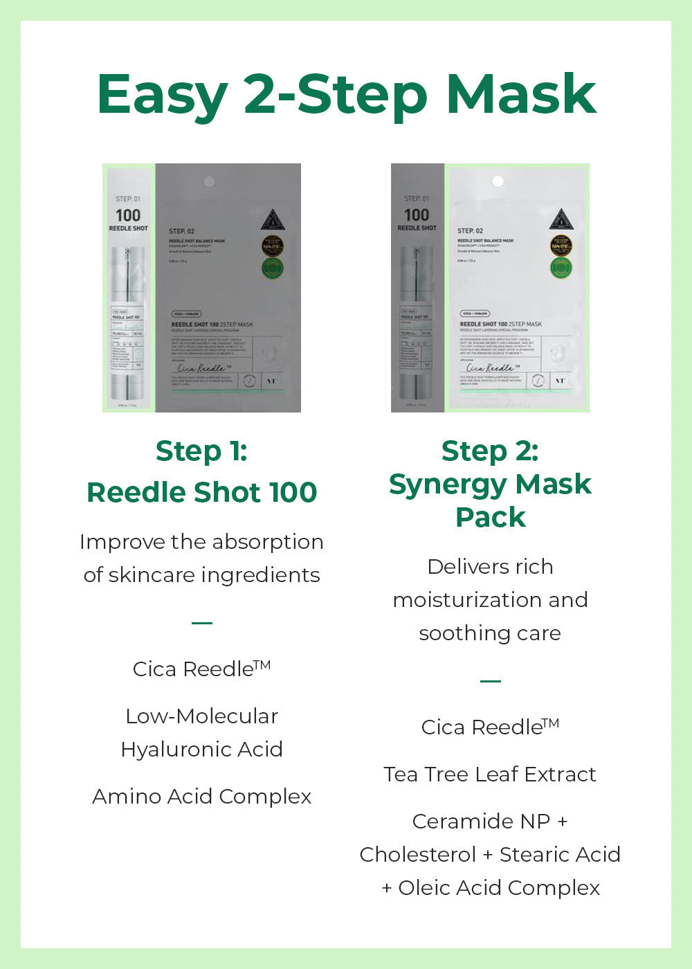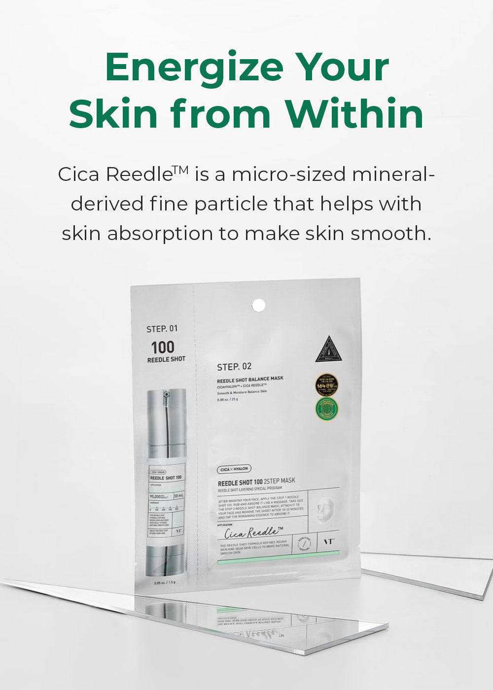 Improve skin texture and shrink enlarged pores with this two-step mask pack. The first step contains VT’s Reedle Shot 100, a skin treatment formulated with CICAHYALON™ for hydrating and soothing care. It’s powered by Cica Reedle™, an innovative skin care technology that imitates microneedling treatment to deliver low-molecular active ingredients deep into skin. The second step of mask includes the Reedle Shot Balance Mask that locks in moisture on skin and enhances the effectiveness of the Reedle Shot 100 ampoule. Suitable for all skin types including sensitive skin.